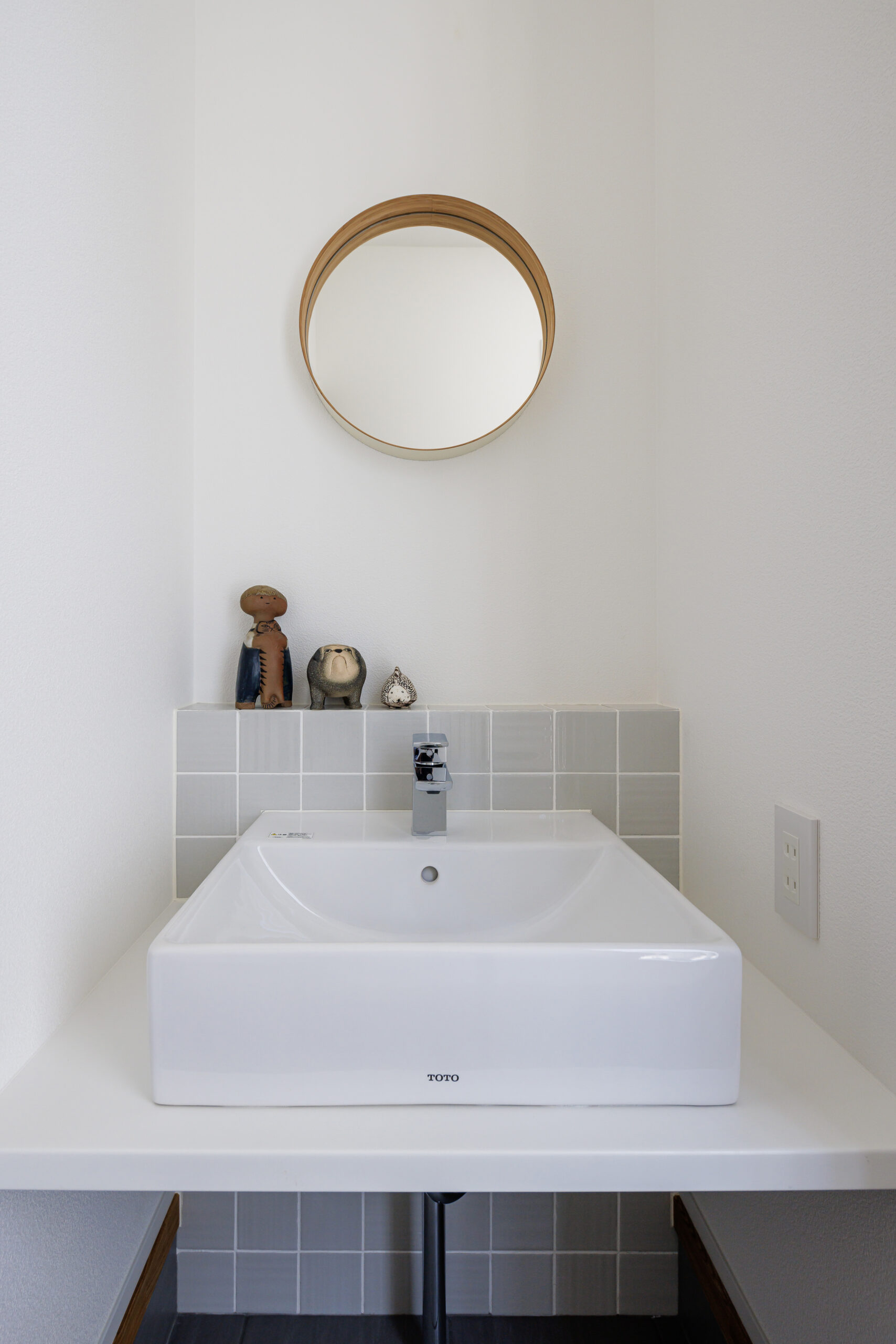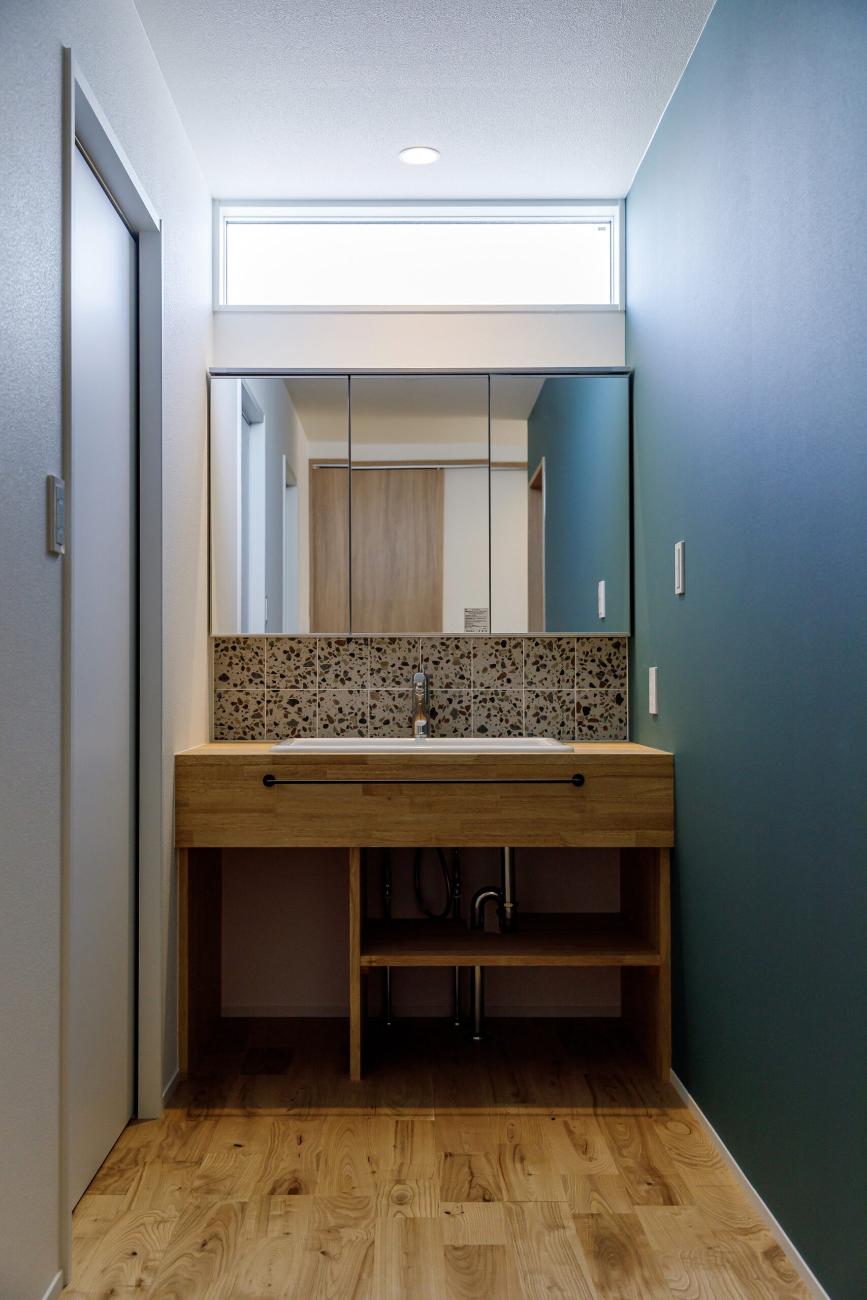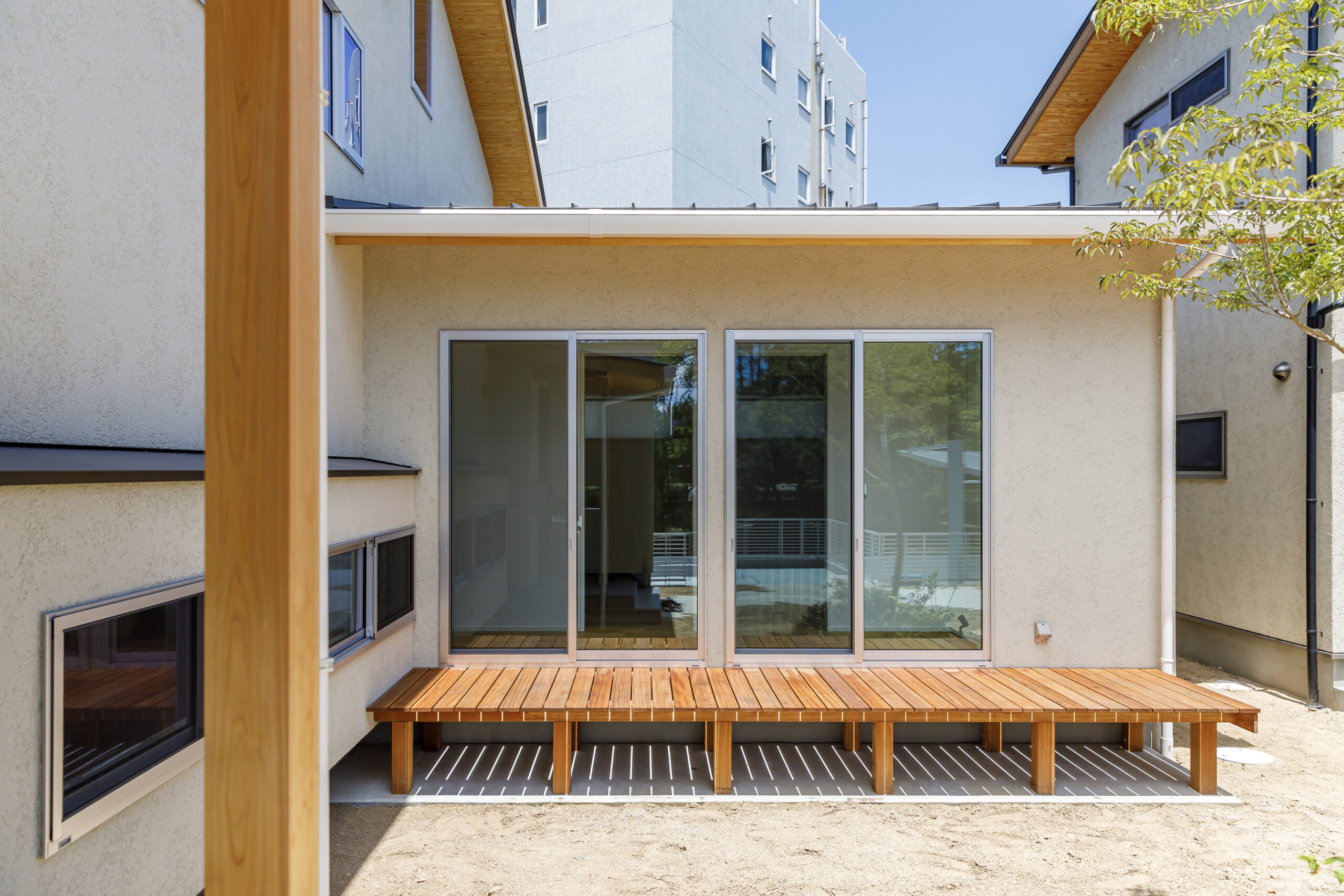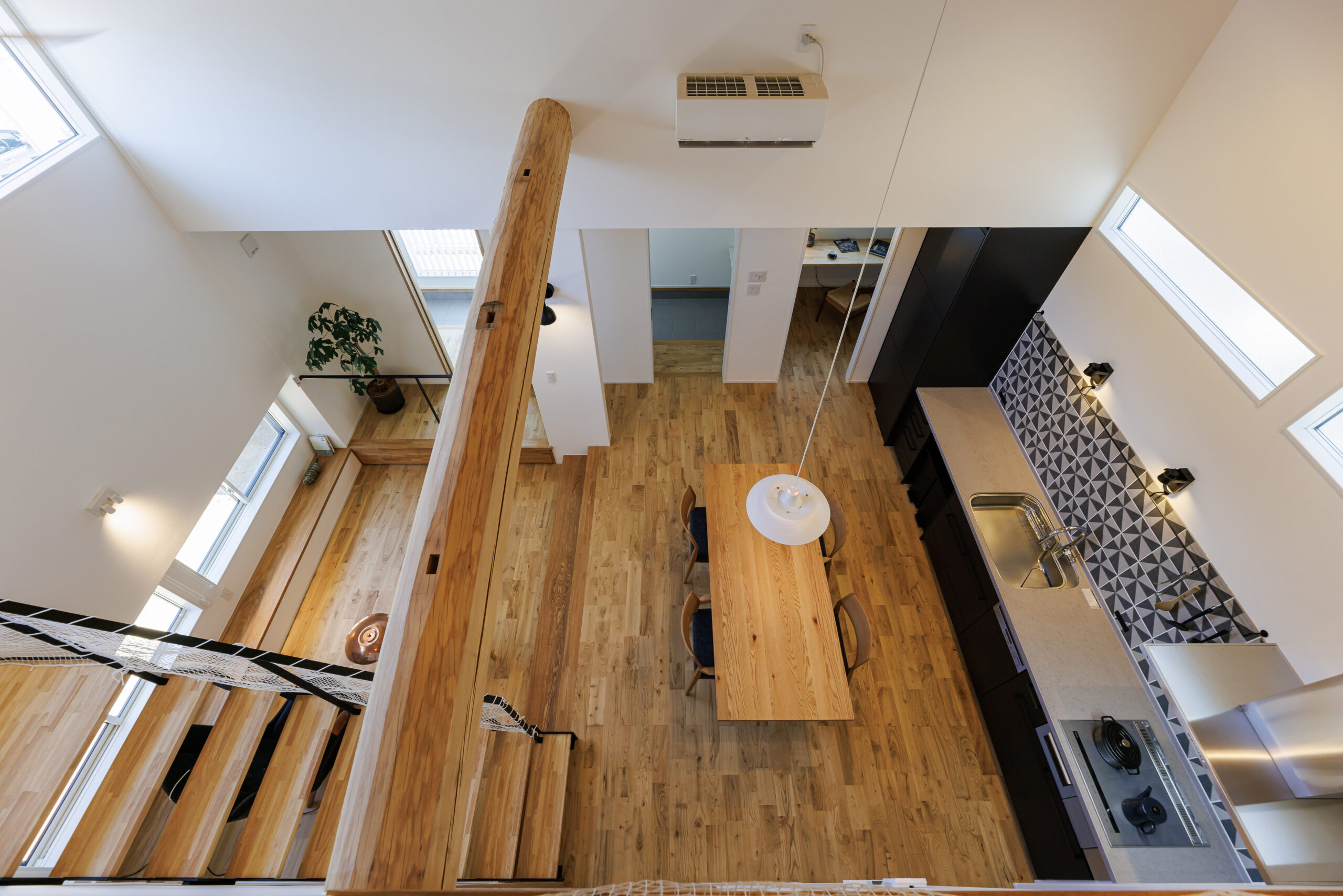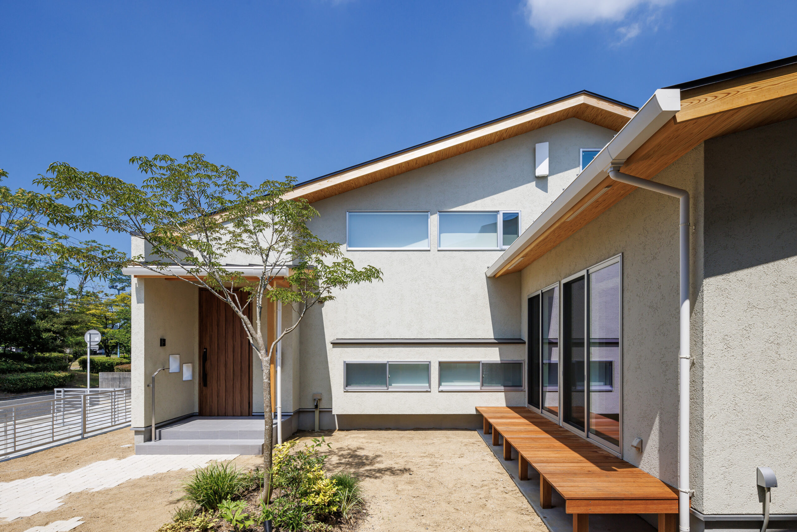 同じ敷地内に親世帯と子世帯の建物を個々に建築するという、新しいカタチの2世帯住宅。お互いのプライバシーは守りつつ、親世帯の様子を把握できる工夫や、家族みんなが集まれるシンボルツリーのある庭。建物は個性的なデザインと家事動線・収納の使い勝手にもこだわったワガママな家。見どころは、ワンポイントに個性的なタイルやアイアン階段・ダウンフロアなリビングを採用したデザイン。そして、ママに嬉しい玄関からキッチンへの直接動線、キッチン⇔パントリー⇔洗面室(ランドリースペース)の動線など使い勝手にもこだわった1.5階のある平屋風な家。