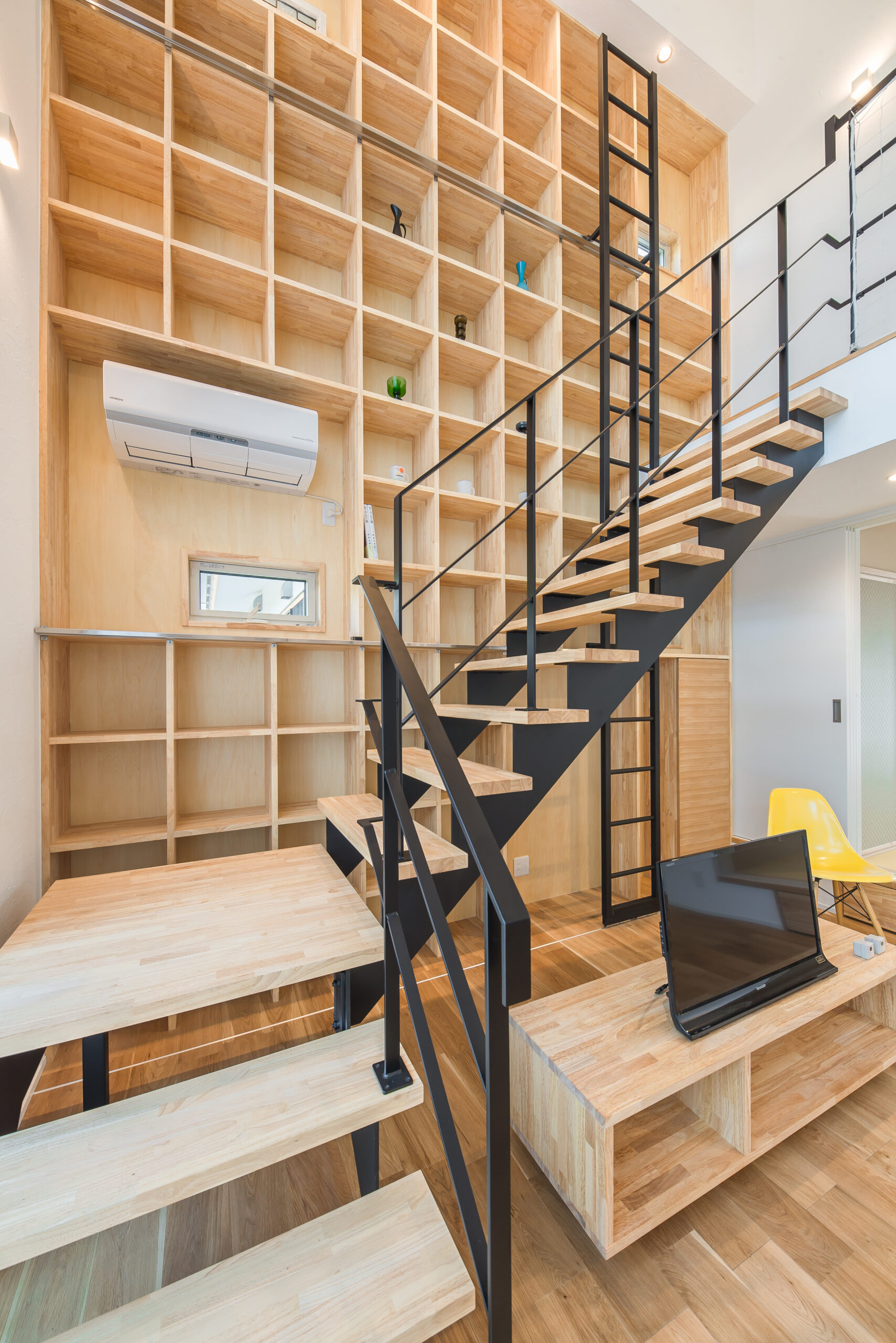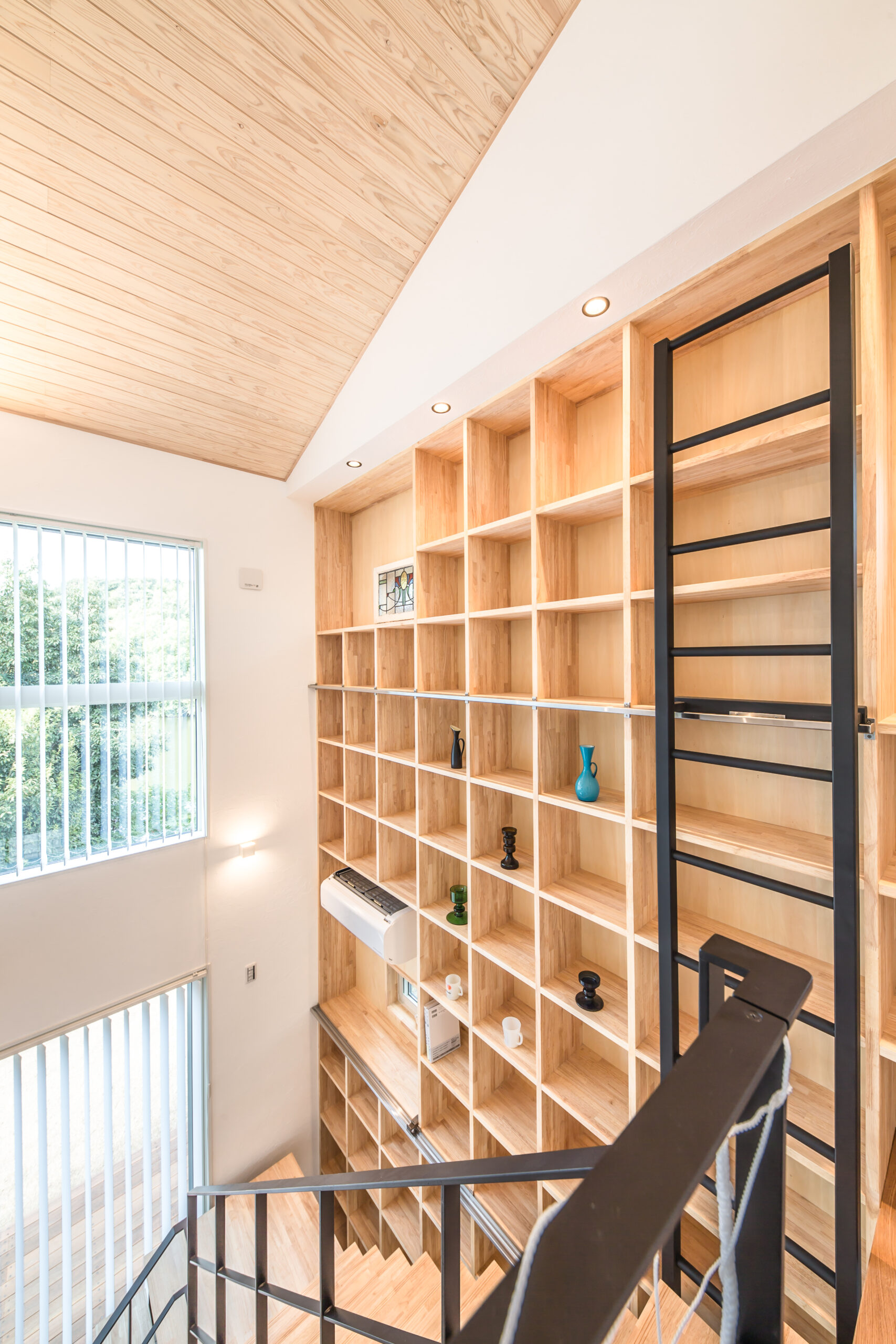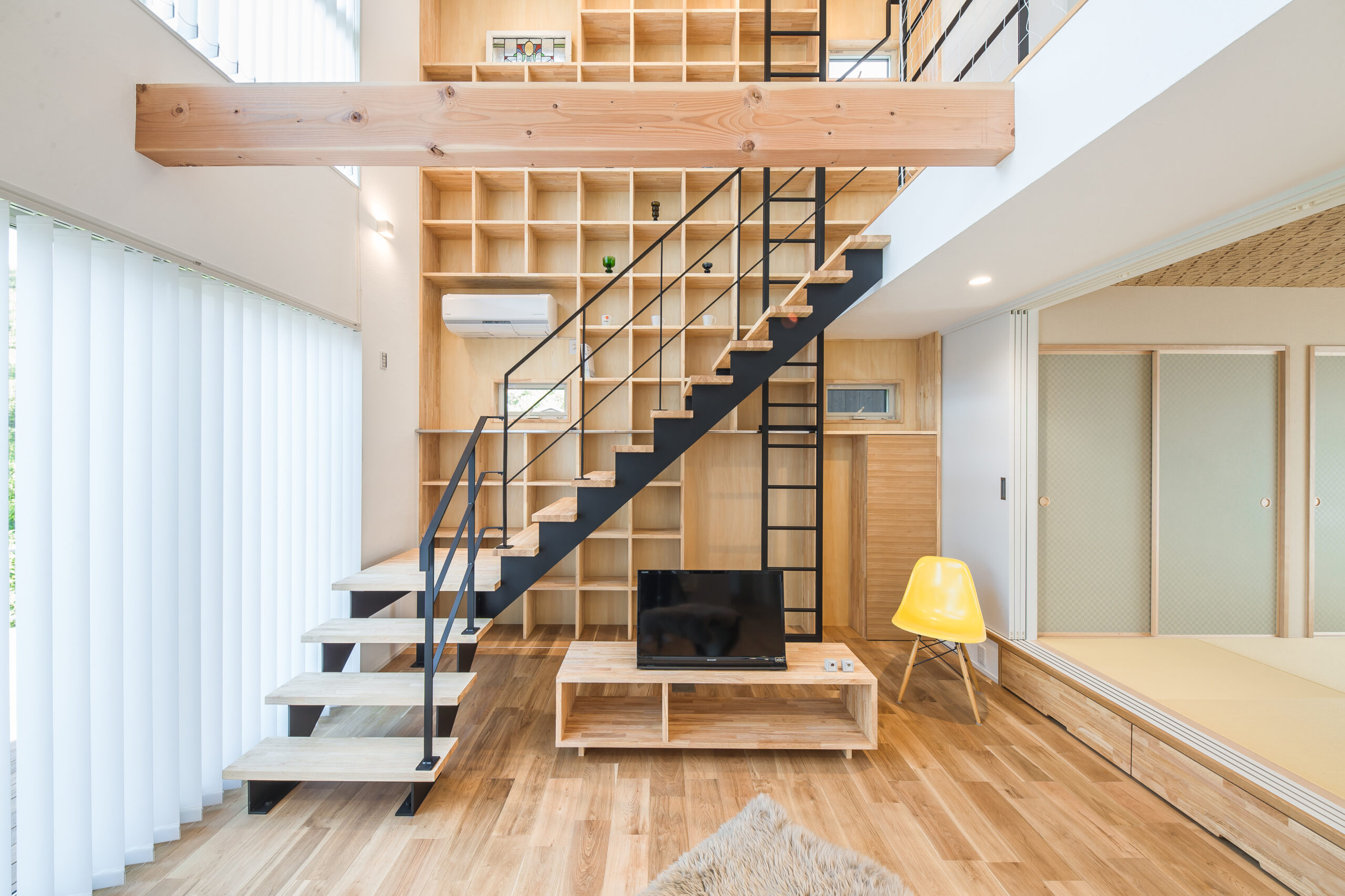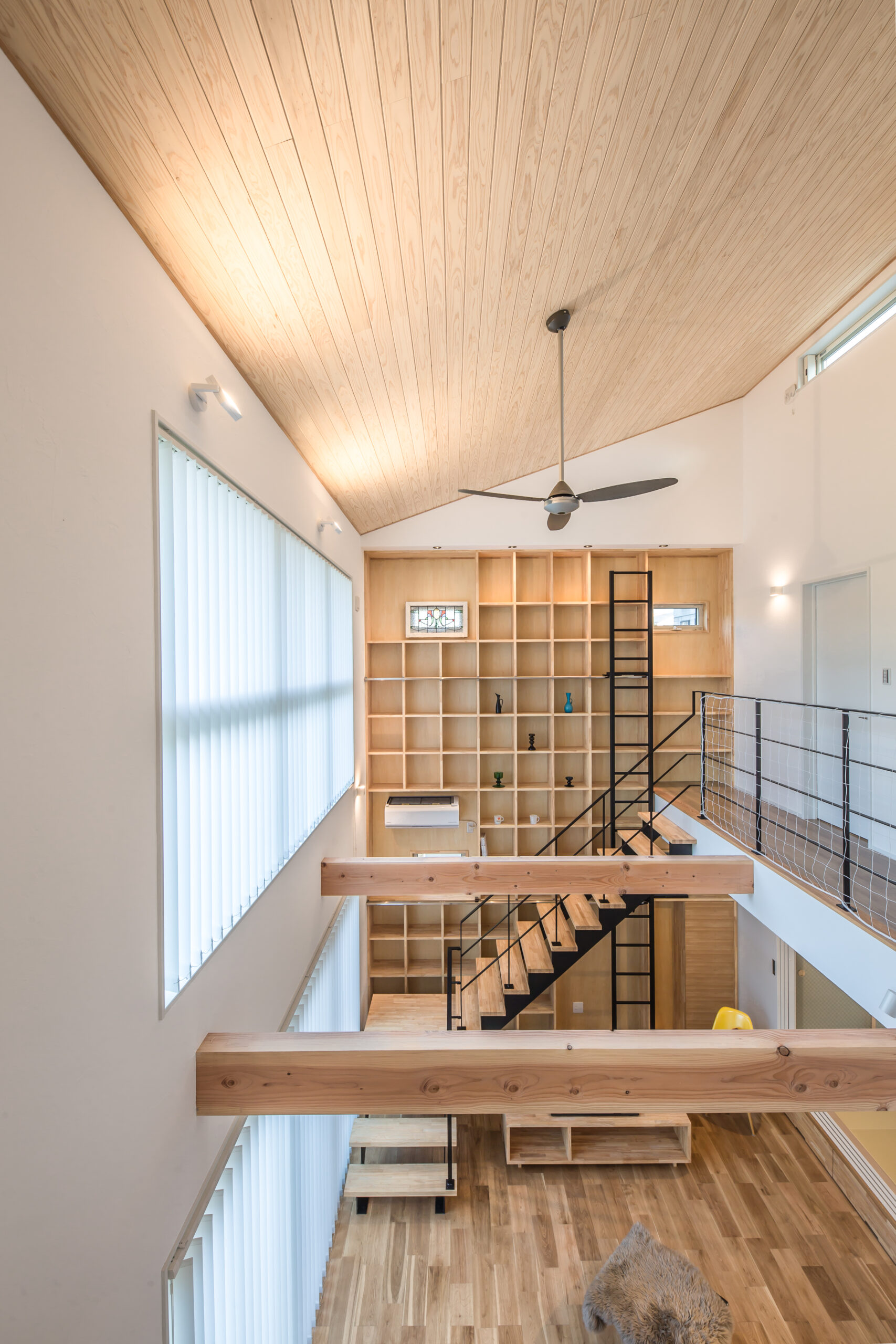 大まかな設計は、ご友人の設計士に依頼していたM様。リビングに本棚のあるこだわりのプランでした。そこで、その要望をいかに予算内で叶えられるか具体的な設計をさせていただき、最初の案を踏襲しながらも「吹き抜け+本棚」というプランをご提案しました。下から上まで本棚でスライド可能な特注のハシゴを掛け、階段のアイアンも特注し、図書館のようなリビングに。吹き抜けを見下ろせる2階の書斎にも大きな本棚を造作。本好きにはたまらないお家が完成しました。