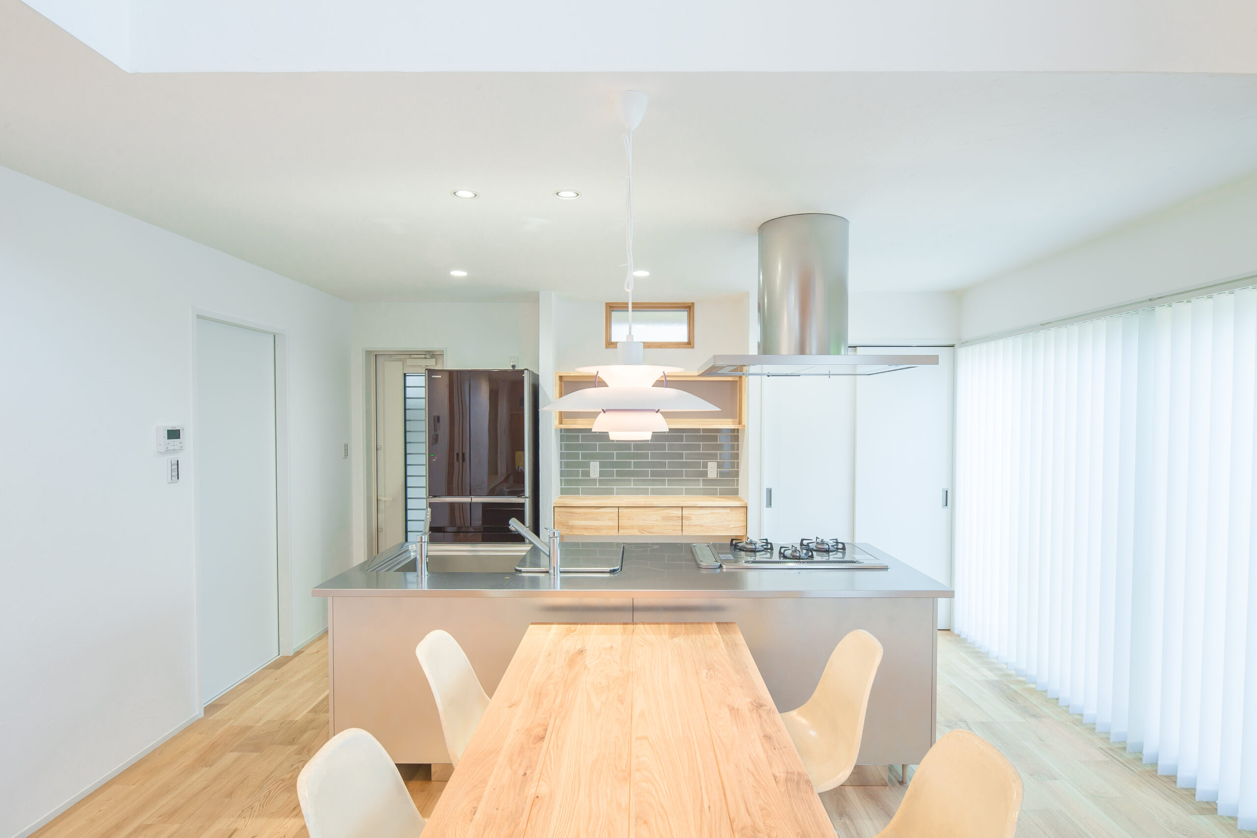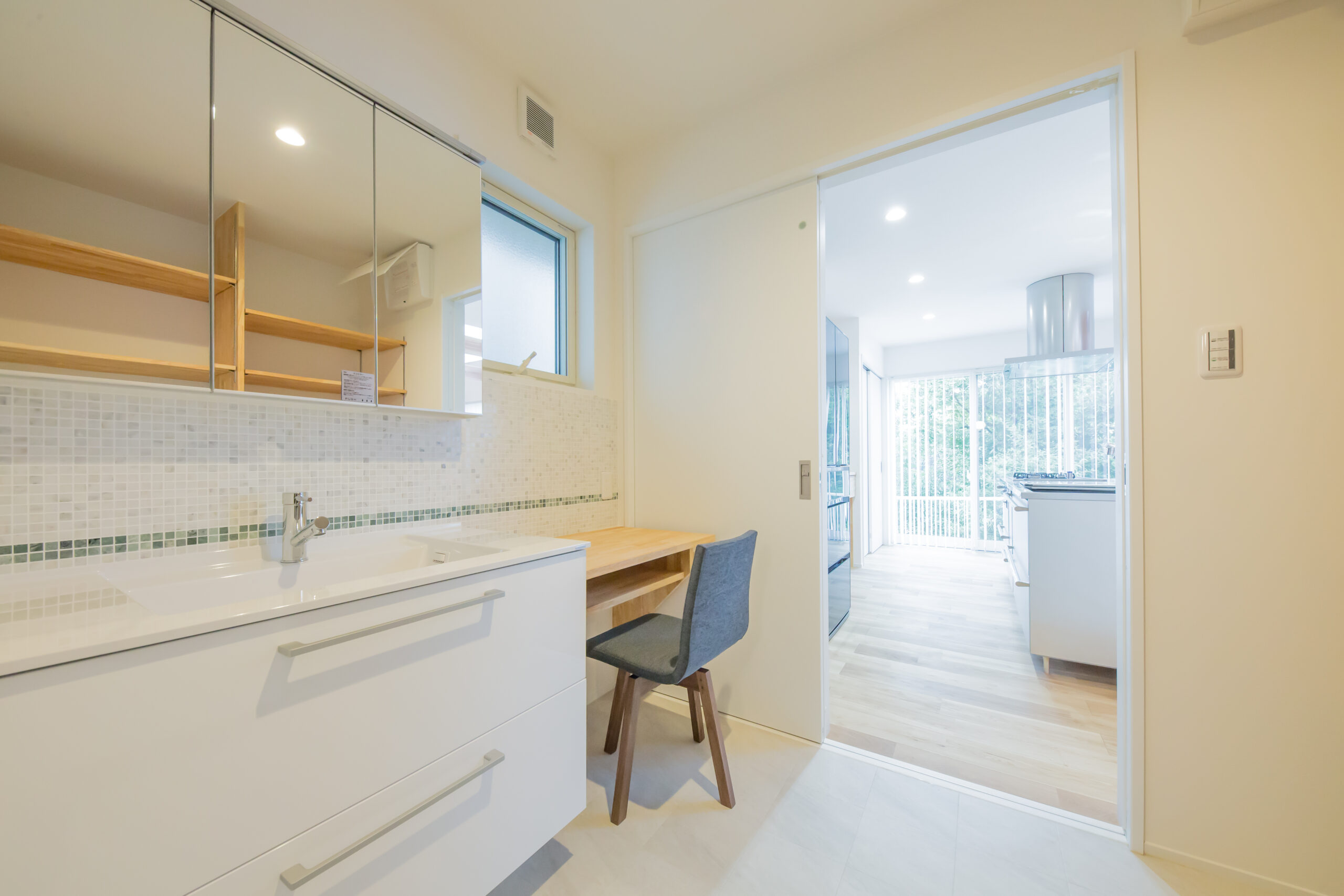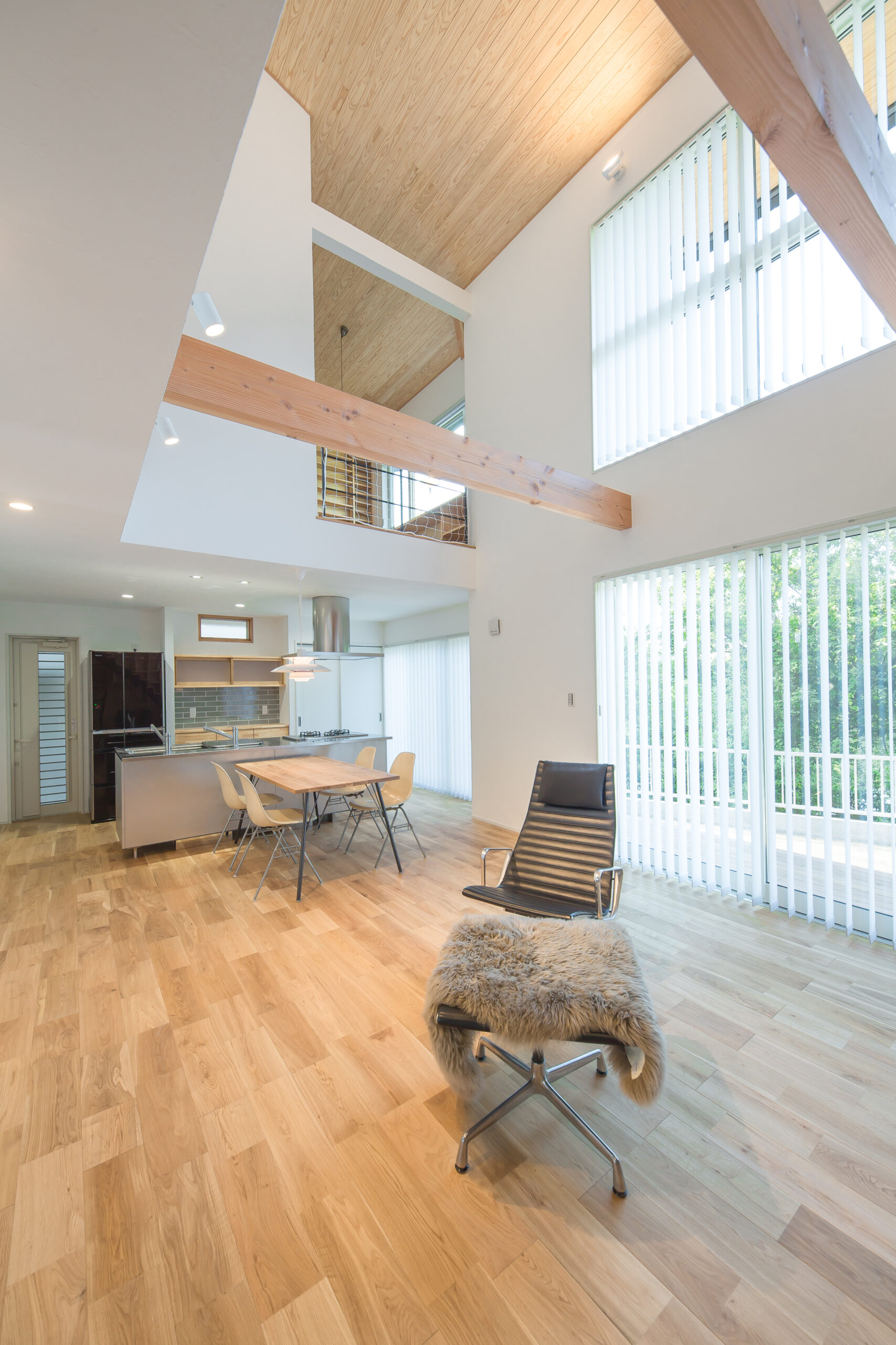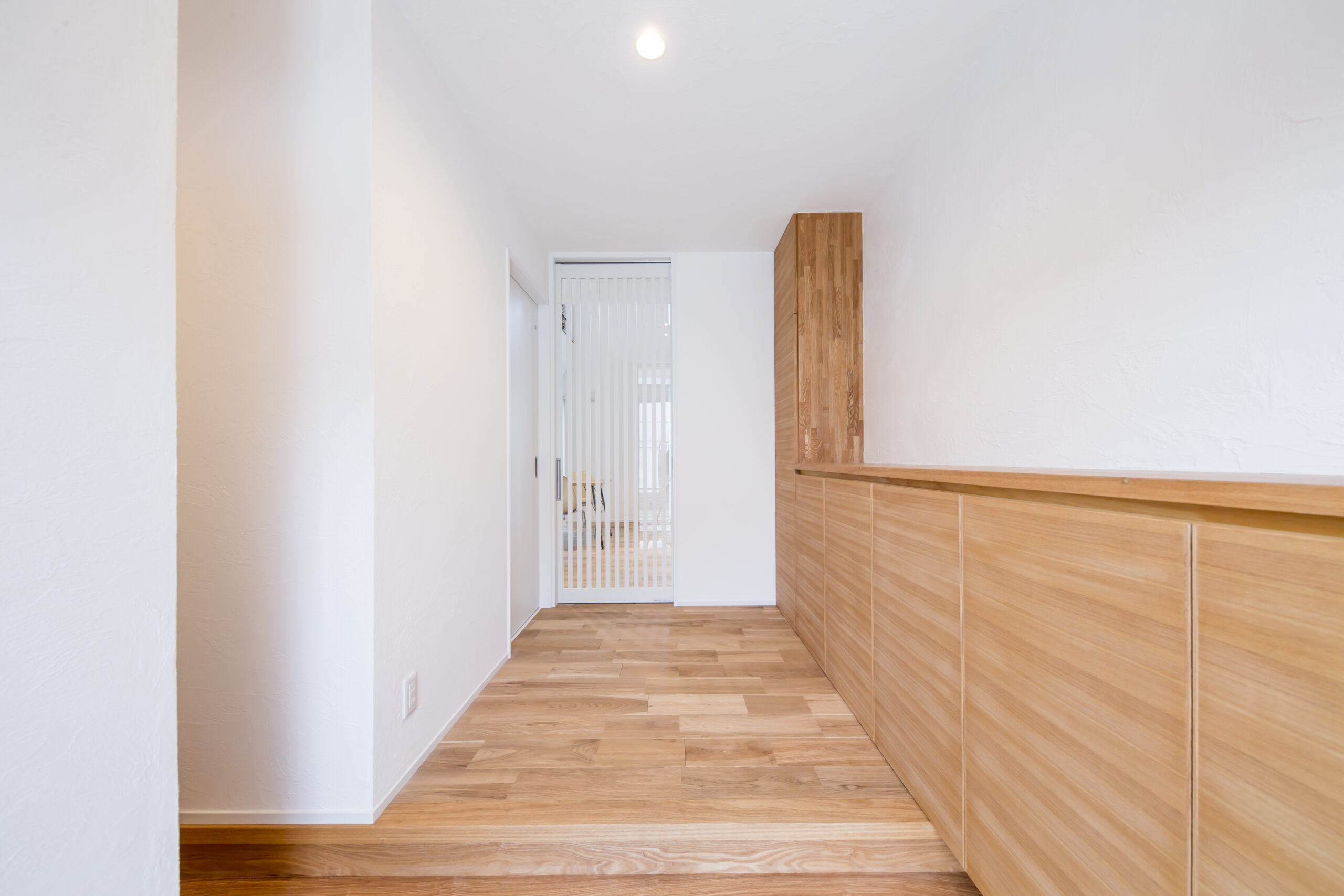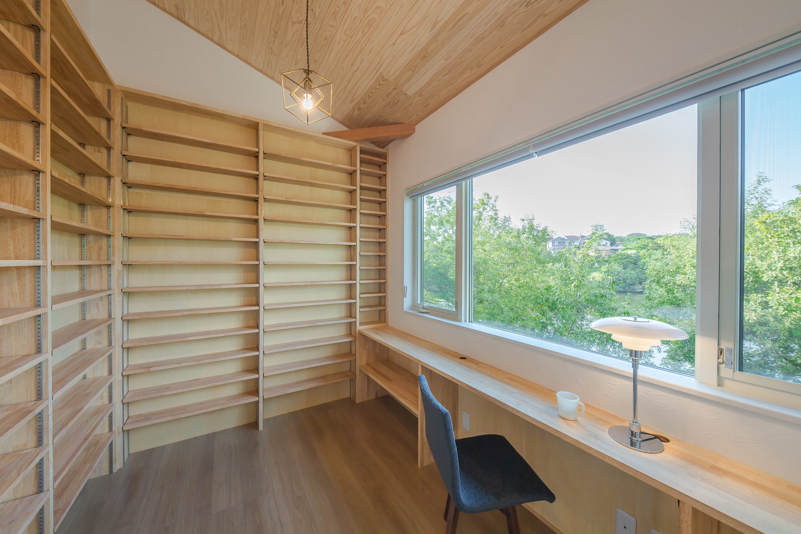 大まかな設計は、ご友人の設計士に依頼していたM様。リビングに本棚のあるこだわりのプランでした。そこで、その要望をいかに予算内で叶えられるか具体的な設計をさせていただき、最初の案を踏襲しながらも「吹き抜け+本棚」というプランをご提案しました。下から上まで本棚でスライド可能な特注のハシゴを掛け、階段のアイアンも特注し、図書館のようなリビングに。吹き抜けを見下ろせる2階の書斎にも大きな本棚を造作。本好きにはたまらないお家が完成しました。