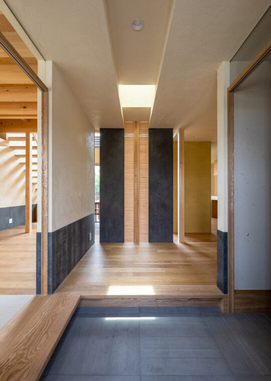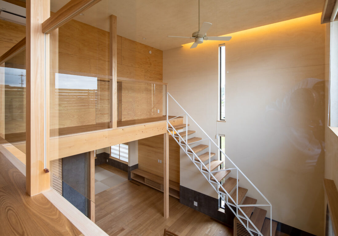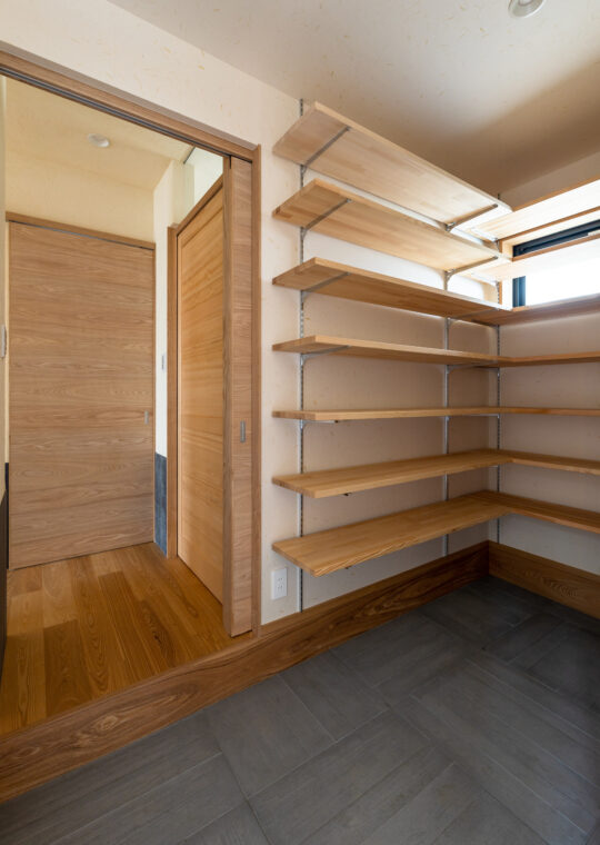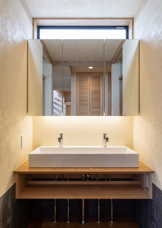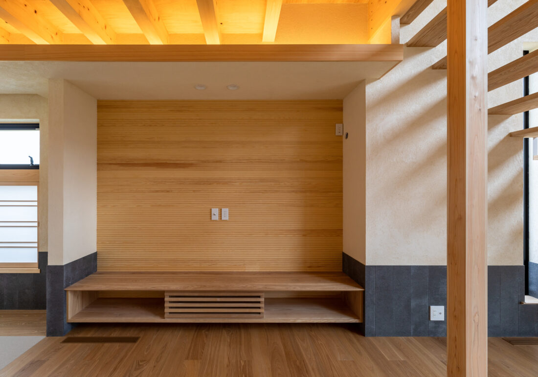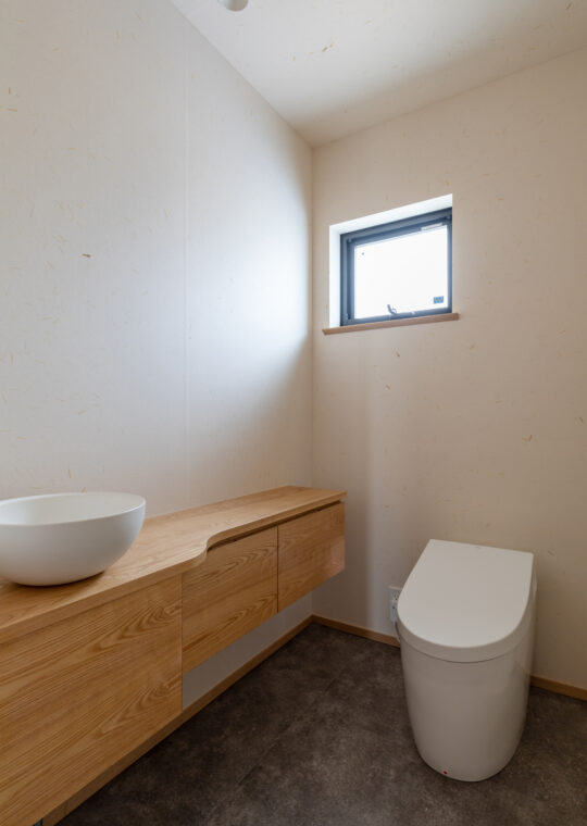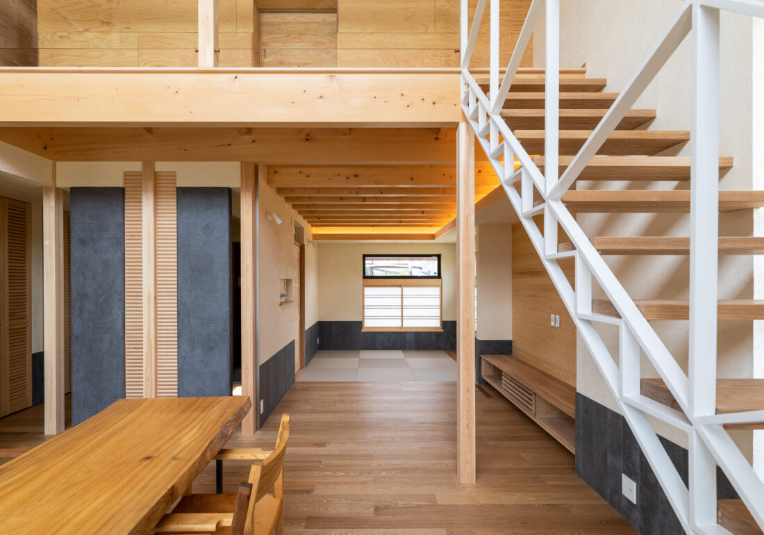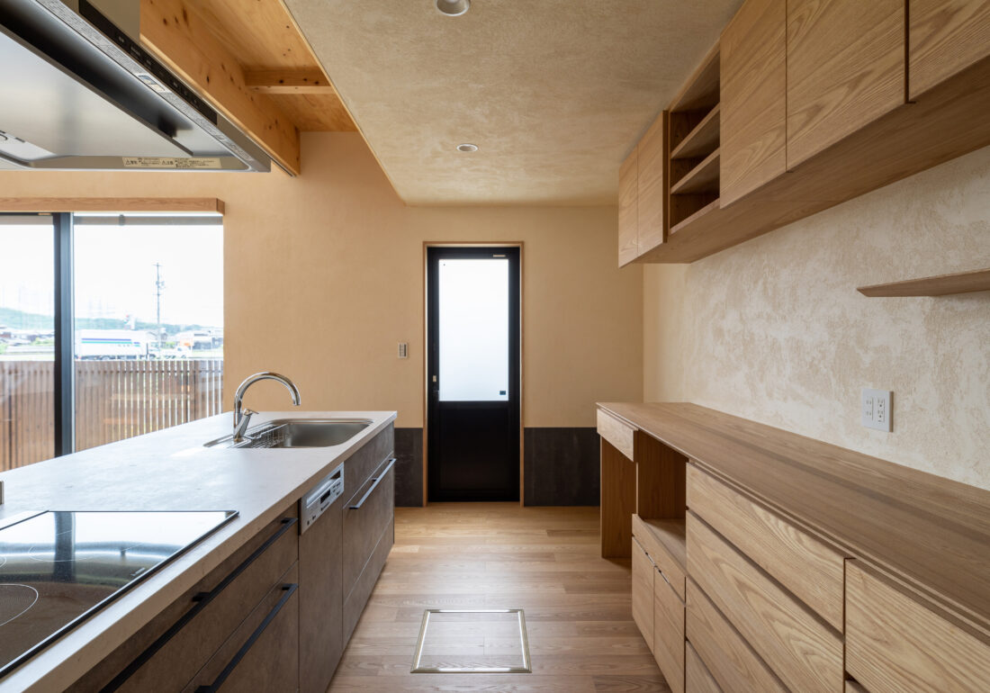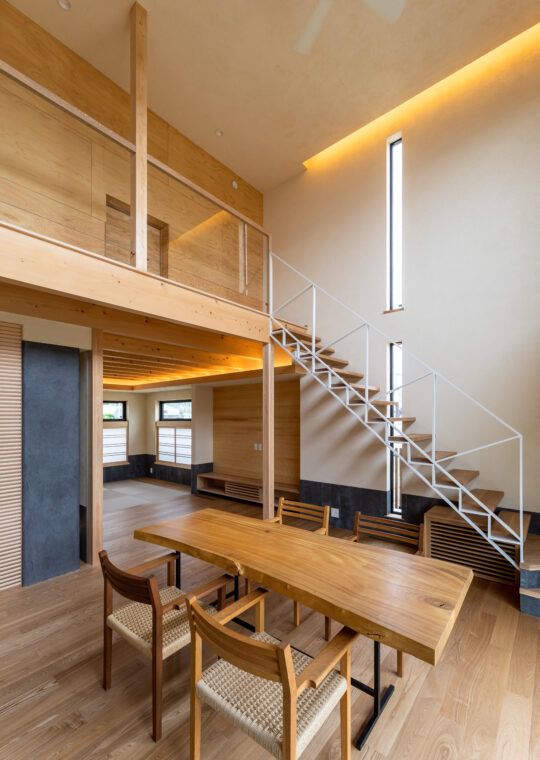 大きな吹き抜けを設けて家族のつながりと明るさを両方兼ね備えた間取り。高性能住宅だからこそできる大胆な開放的な大空間。大工が厳選して選定した素材を、大工の腕を活かして造作している家。日当りや風通しも考えLDKに約10帖の吹き抜けを配置した間取りとプライバシーを保ちつつ、一日中明るく無駄なスペースをなくし開放的で心地よい空間。玄関からシューズクロークを通って直接、キッチンや洗面室に進める家事ラク動線。大工が創る洗面扉やカップボード&吊り収納は木目が真っすぐで硬く桃色を帯びた優しい色味が特長のレッドオークを使用しています。大工の工夫と閃き・腕が光る想いのこもった1邸となっております。