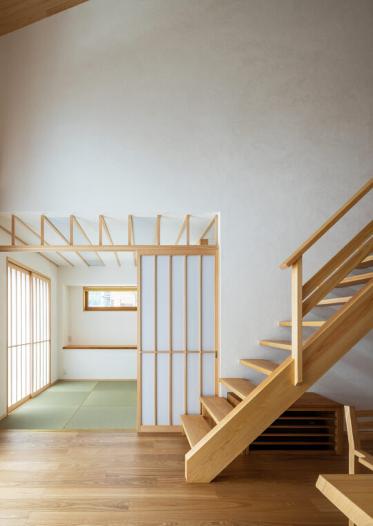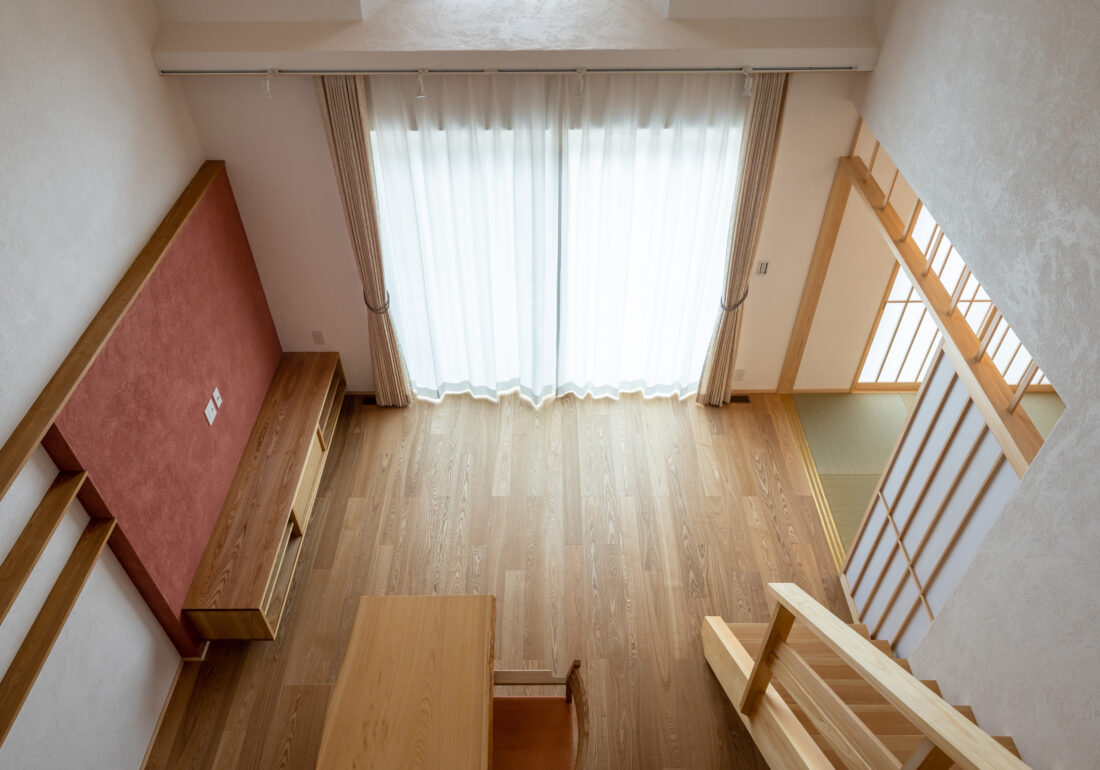 日当りや風通しも考えLDKに約11帖の吹き抜けを配置した間取りになっています。南面の窓は大きく日中は自然光だけで充分明るく開放感と、つながりのあるLDKに。プライバシーを保ちつつ、一日中明るく無駄なスペースをなくし開放的で心地よい空間。家の性能と大工造作の家具もみどころ。