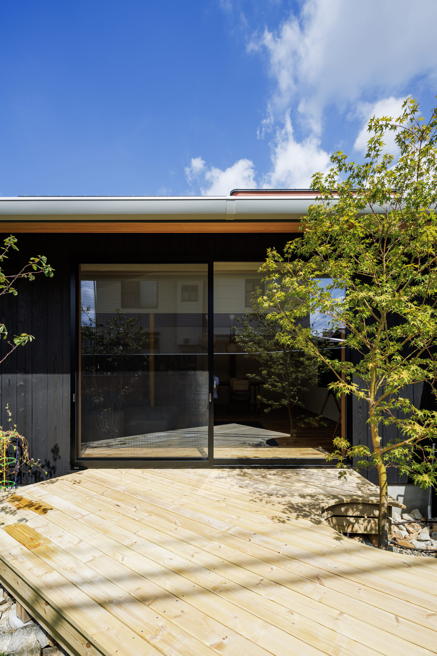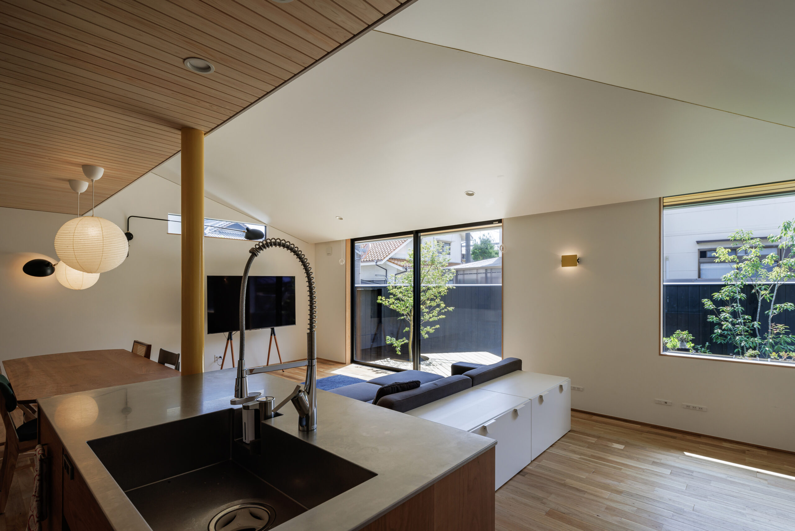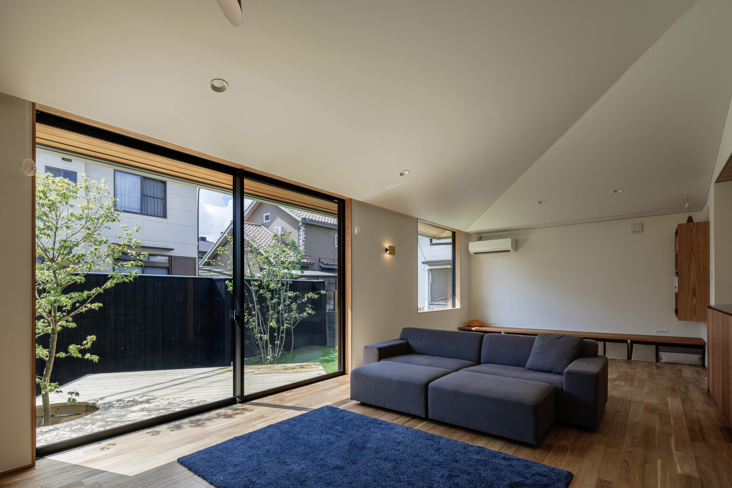 お客様の日当たりのよい広いリビングをという要望で広さもあり庭を活かした開放感のあるプランをご提案。店舗兼住宅とのことでご家族のスペース、店舗のスペースを互いに気兼ねなく過ごせる住宅を設計しました。生活感を隠しつつキッチンを中心に家事同線を確保しています。インナーガレージがあるので小さなお子様がいても買い物帰りでも雨に濡れず室内へ入れます。また庭の板塀の高さをとることで外部からの視線もカット。周りを気にせずゆったりくつろげます。
