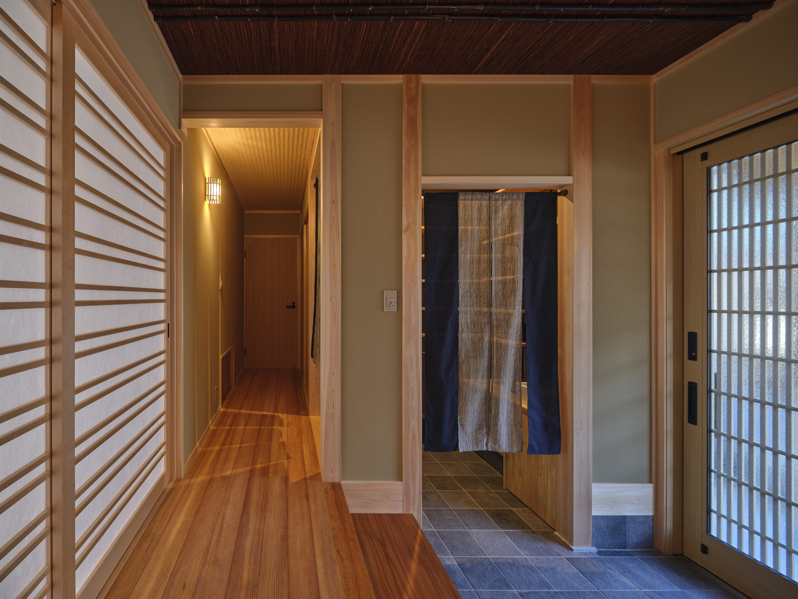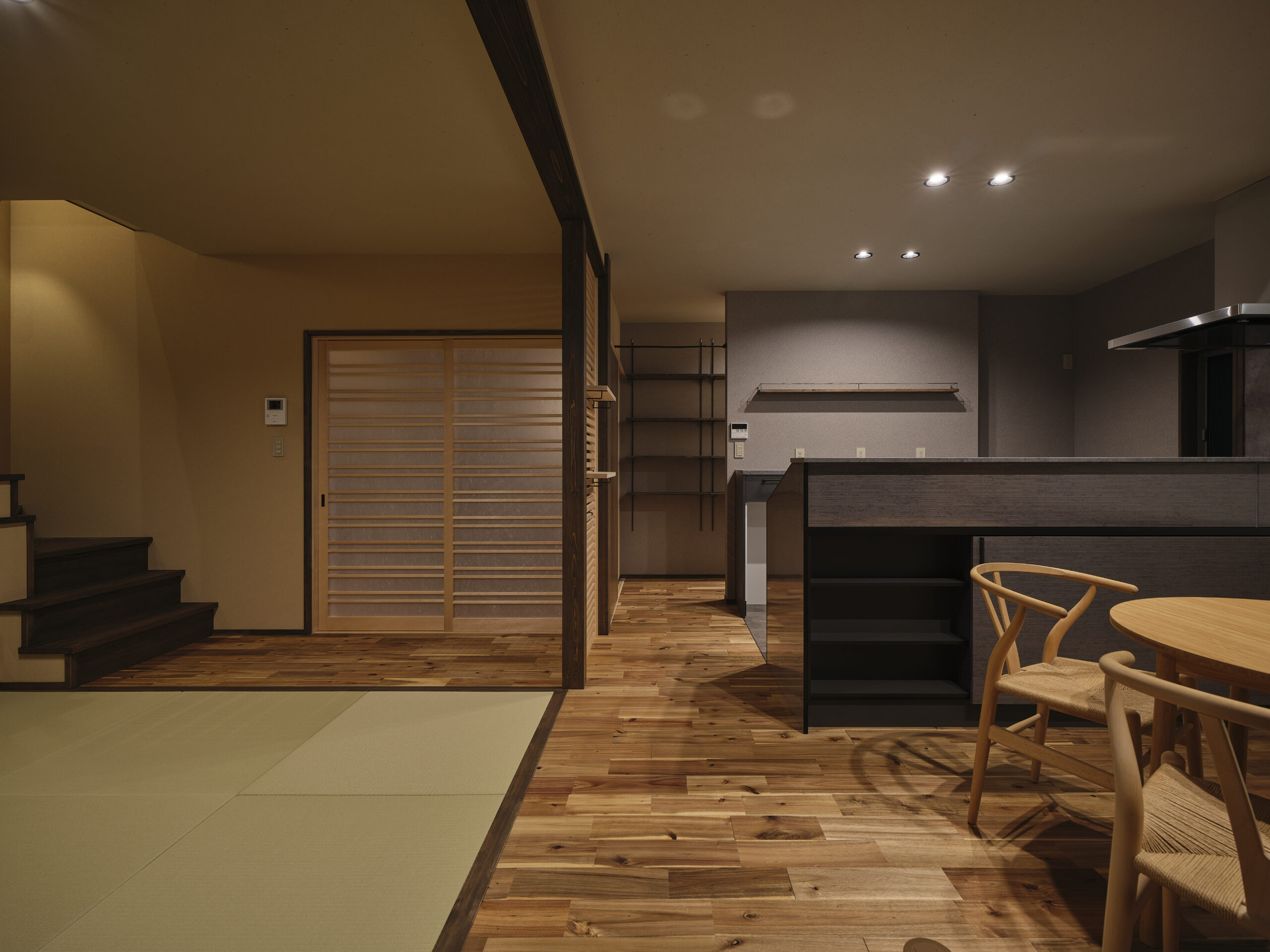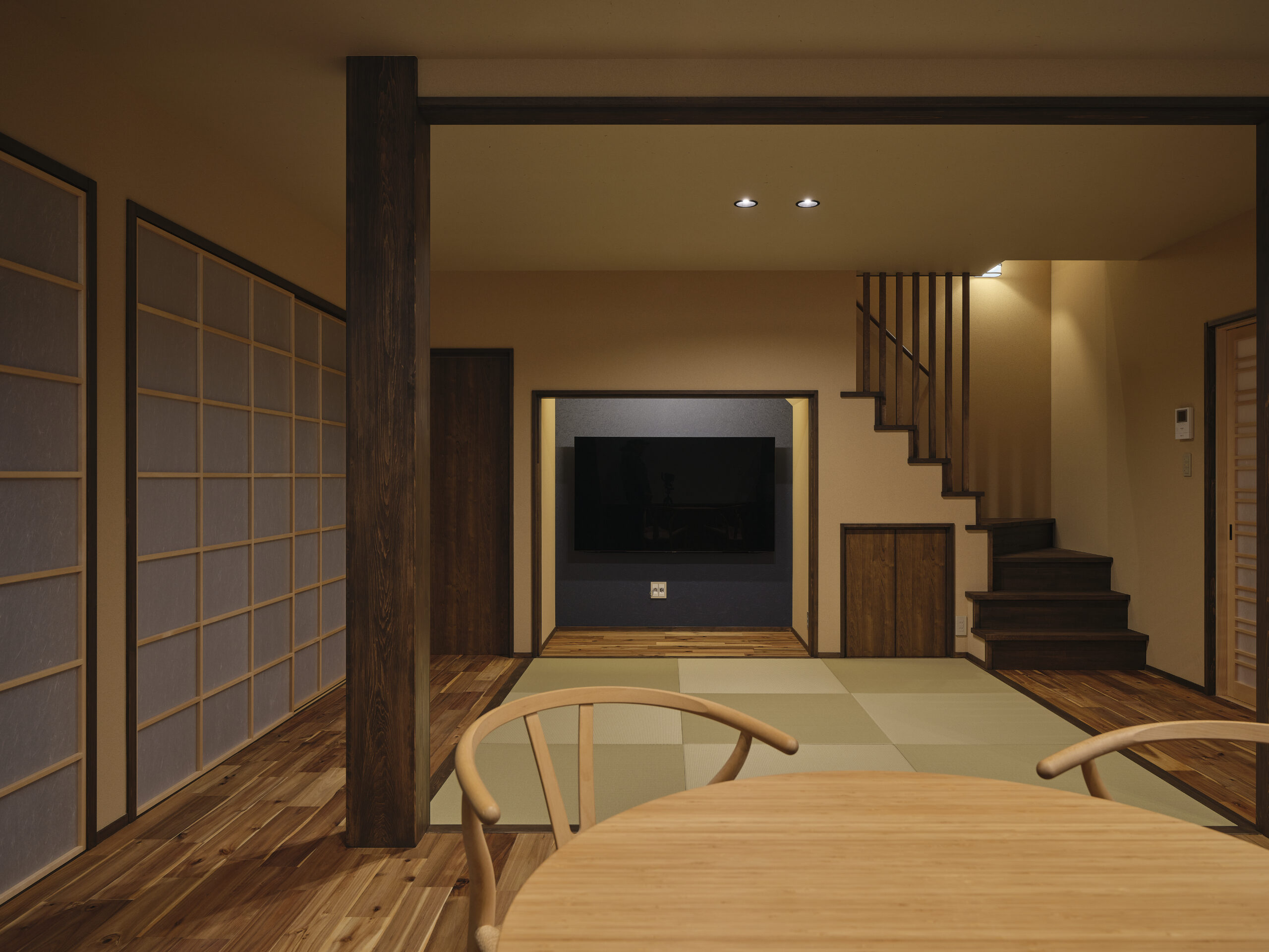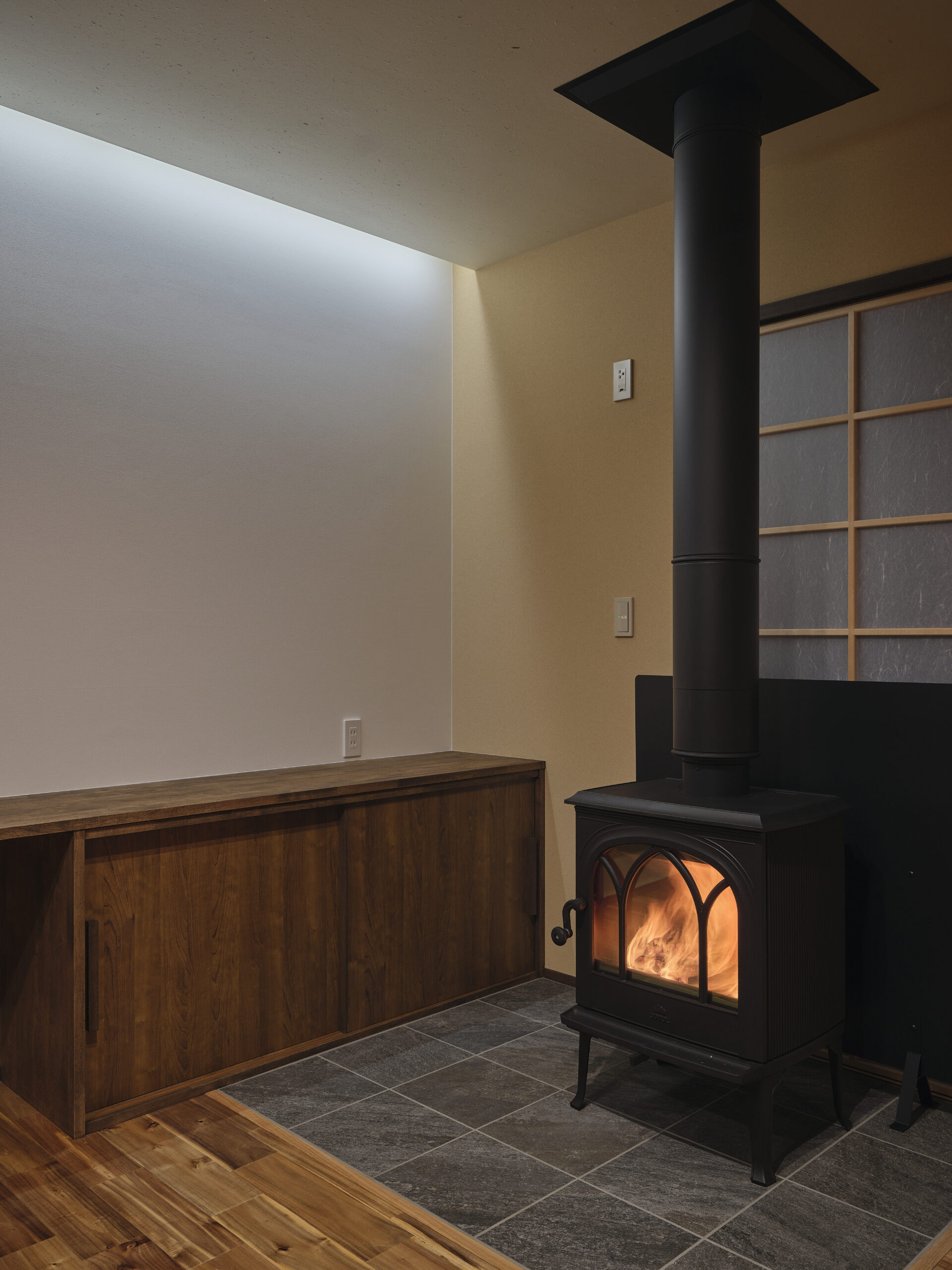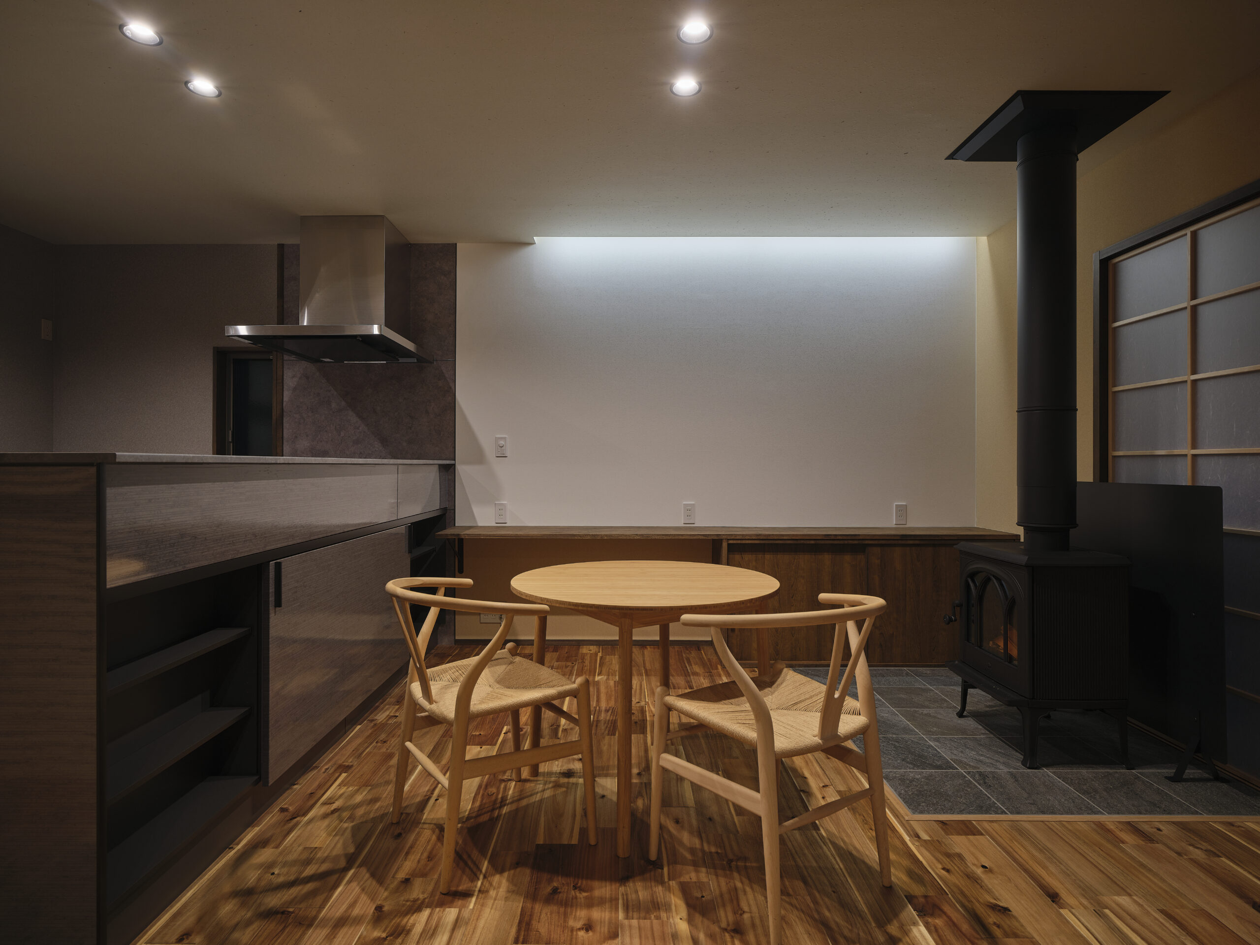 LDKに薪ストーブがあるので家族みんなが自然に集まり優しい炎に癒されます。家全体は和風でありながらコテコテにならないようシンプルな色合いにしています。デザインだけでなく家族が使い易い動線設計や収納効率があがる工夫が詰まったリノベーションです。