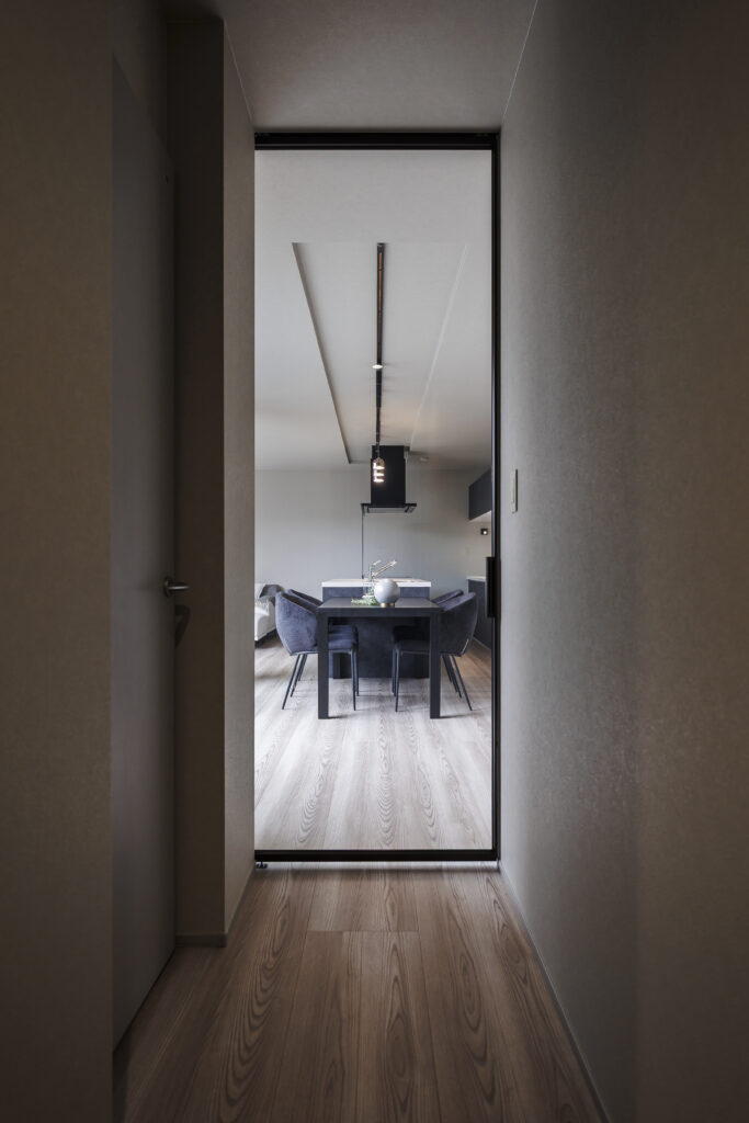 ■ LDKの入り口にはガラスドアを採用。見た目もオシャレ、視線が抜けて開放感があり、中庭からの光が廊下まで抜けて◎