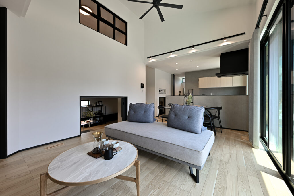 ブラックのシーリングファンやブラック格子のデザイン窓がアクセントの開放感のある吹き抜けリビング