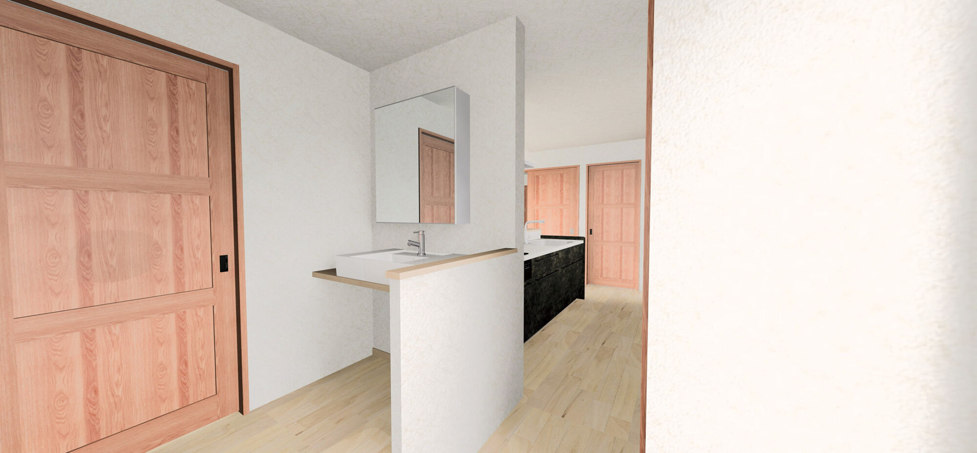 玄関からリビング⇔造作洗面⇔パントリー⇔キッチンと回遊できる動線。