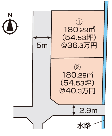 - ①号地:180.29㎡(54.53坪) ②号地:180.29㎡(54.53坪)