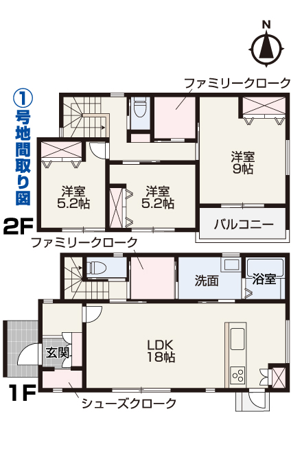 1階・2階にファミリクローク、玄関にシューズクローク、各居室にも収納があります